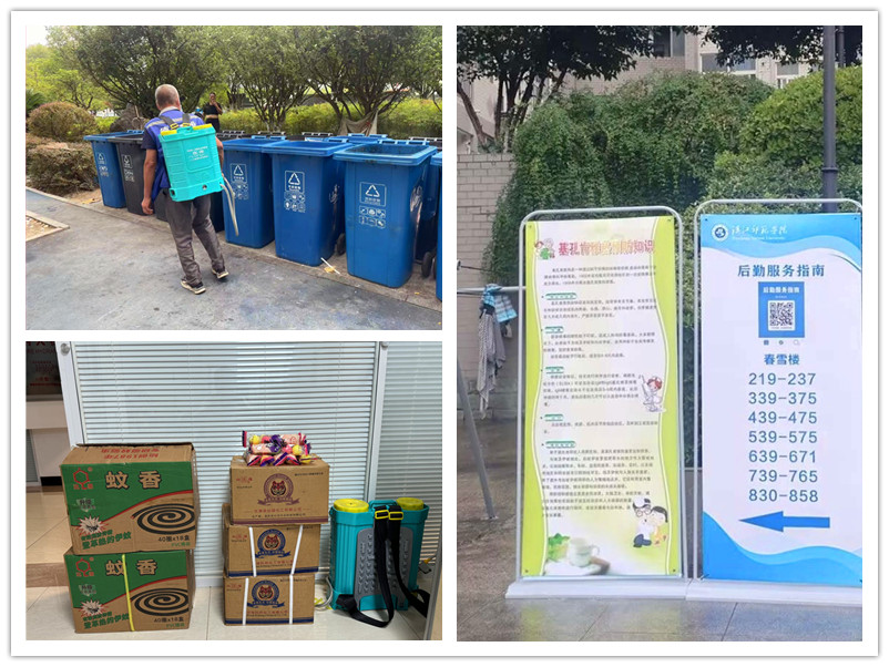 精准开展防蚊灭蚊消杀。对公共区域开展“地毯式”喷洒或采用“超低容量喷雾 + 滞留喷洒”组合方式进行灭蚊消杀;对积水容器、下水道、墙角缝隙等蚊虫易滋生死角进行重点消杀;在教室、学生寝室、办公室、卫生间等室内区域放置蚊香;在绿化带放置太阳能灭蚊灯;对水系(如景观池、蓄水池、盆栽碗莲等)投放了氯菊酯灭蚊剂等。确保防蚊灭蚊精准,不留盲区。